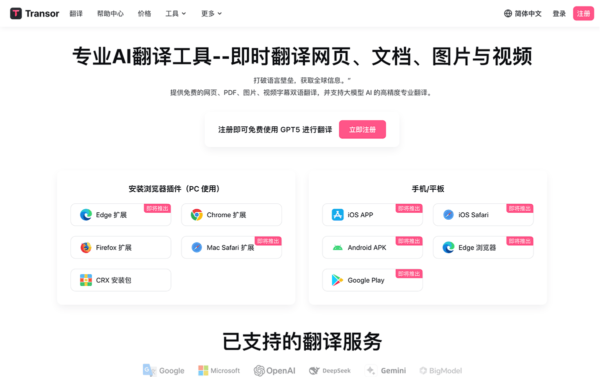Transor提供Chrome、Firefox浏览器插件,即将推出Edge、Safari版,可以去Transor官网获取最新版下载使用,后续还将推出iOS、Android版手机App。