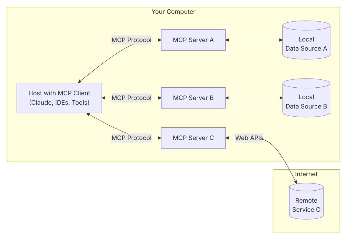 MCP 通过一个简单的系统在您的 AI 应用程序和数据之间架起了一座桥梁: