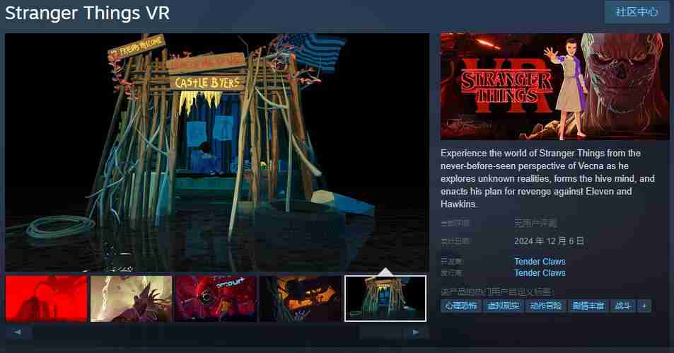 今日(11月7日),"怪奇物语"改编VR游戏《Stranger Things VR》Steam页面开放,预计2024年12月6日发售,暂不支持中文,感兴趣的玩家可以点击此处进入商店页面。