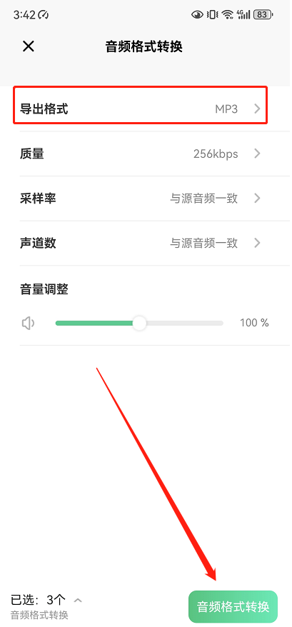 步骤3、导出格式默认的是mp3格式,直接点击「音频格式转换」;