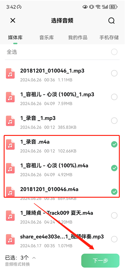 步骤2、选择设备上的m4a格式音频文件,点击「下一步」;
