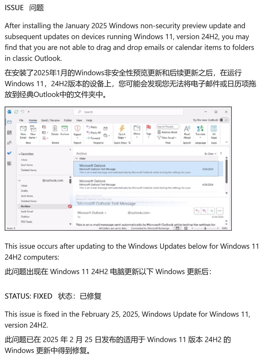 以上就是Win11 24H2 更新导致经典版 Outlook 拖拽失效:2 月可选更新已修的详细内容,更多请关注php中文网其它相关文章!