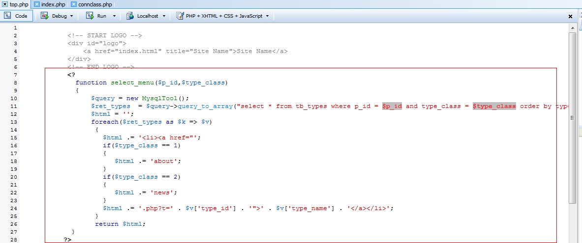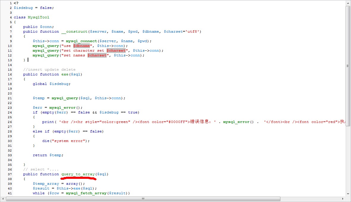 现在问题出在 top.php上面,我用一个函数来生成菜单,但是调用不到query_to_array()这个查询方法了