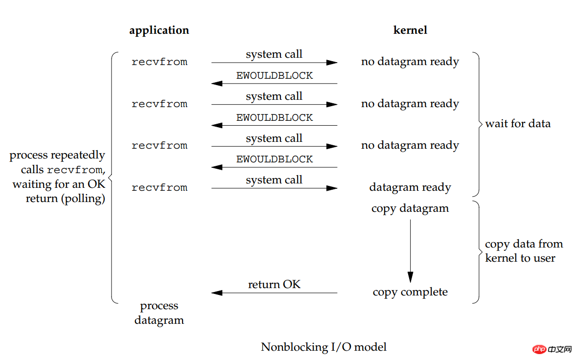 如图所示,这种IO模型的一个改进是IO是非阻塞了,但是需要长轮询,同样浪费CPU时钟周期。