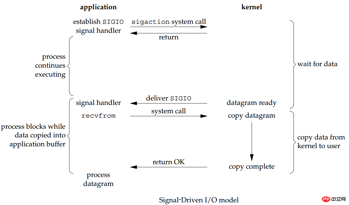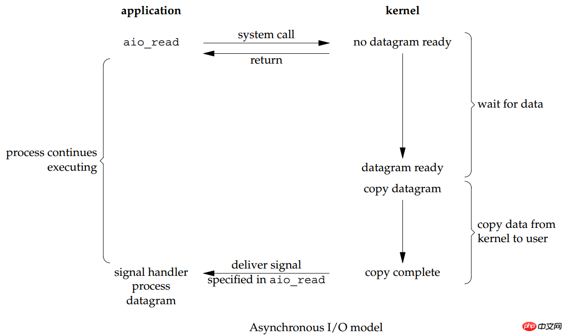 如图所示,资料记载这种IO模型由于对比模型3没有性能优势,同时由于系统支持不稳定,很少为设计者采用。