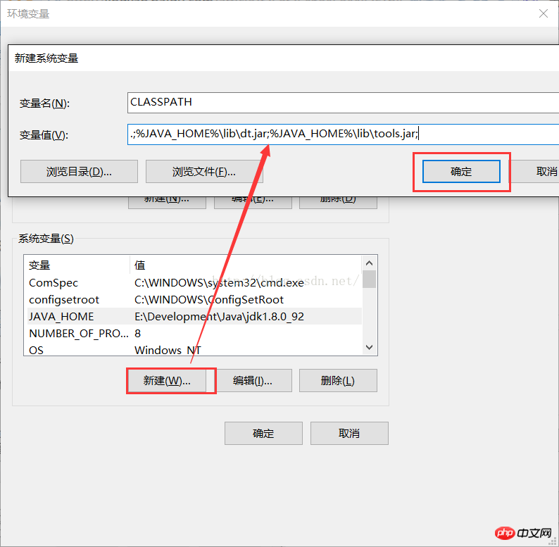 2.再新建一个变量名为“CLASSPATH”,变量值为“.;%JAVA_HOME%\lib\dt.jar;%JAVA_HOME%\lib\tools.jar;”的系统变量,注意前面的点号和分号都是有的
