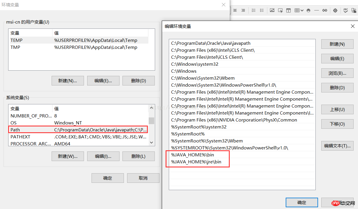 3.打开“Path”系统变量,点击新建,添加“%JAVA_HOME%\bin”和“%JAVA_HOME%\jre\bin”两个系统变量。Path使得系统可以在任何路径下识别java命令