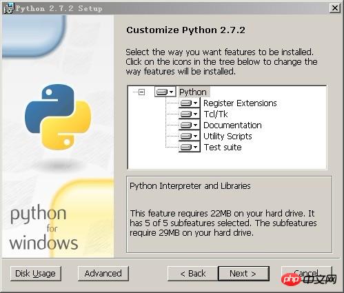单击“Next”按钮,进入Python安装组件选择界面。这里我们安装全部组件,选择默认的设置就可以了。如图2。