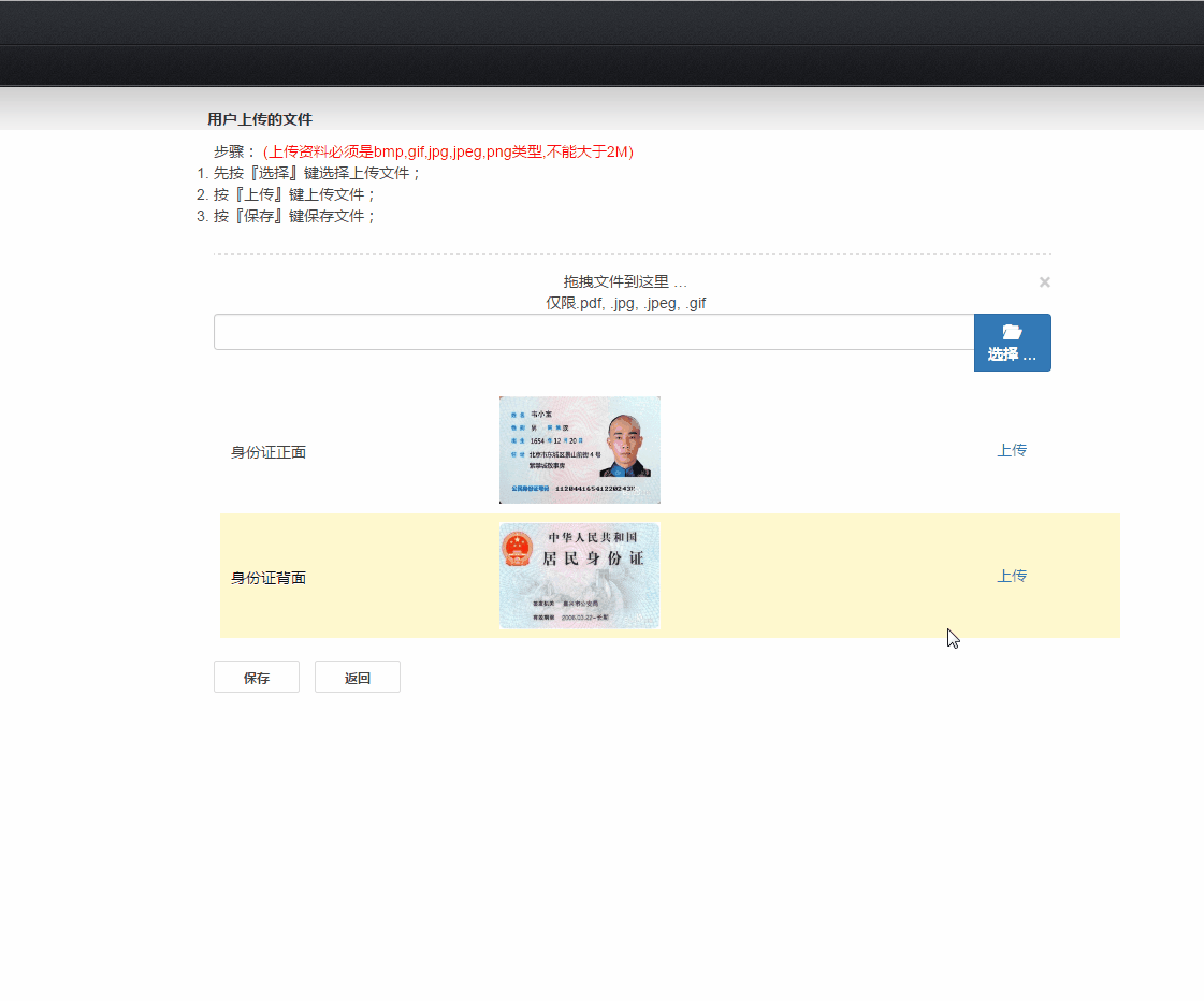 步骤: <span class="red" style="color: red">(上传资料必须是bmp,gif,jpg,jpeg,png类型,不能大于2M)</span>