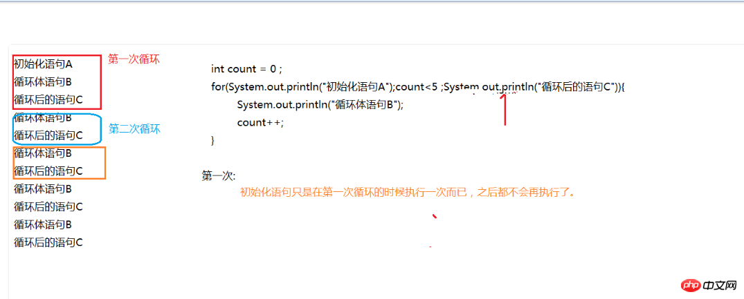 2)for循环语句的初始化语句只会执行一次,只是在第一次循环的时候执行而已。