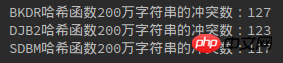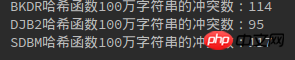 以上只是列举了三种哈希函数,我们做下试验,看看它们的冲突情况是怎么样的。