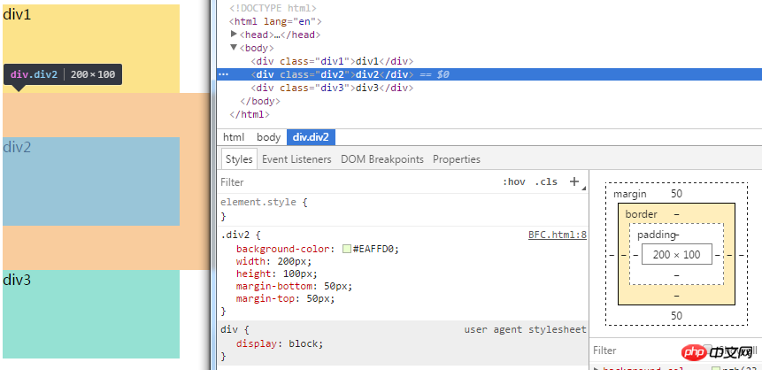 本来div1的下边距为50px,div2的上边距为50px,按道理他们之间的距离应为100px才对,可是这里却只有50px了,这是因为在一个块级排版上下文中相邻的两个块级盒之间的垂直margin是折叠的,也就是在CSS学习笔记07 盒子模型中介绍过的外边距合并,那如何解决这种外边距合并的现象呢,这个就涉及下面要介绍的BFC了。
