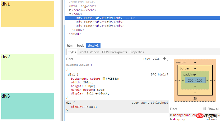 可以看到,块级元素的排列顺序是从上往下,即使所在行的宽度可以容纳多个元素,现在同时给div1与div2添加外边距