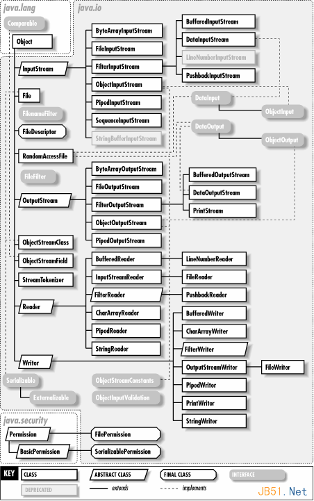 流的读写来自于四个基类: InputStream, OutputStream, Reader和Writer。InputStream和Reader是处理读取操作,OutputStream和Writer是处理写入操作。它们都位于java.io包中。继承关系如下: