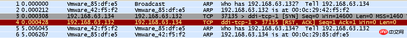 可以看到host:192.168.63.134向host:192.168.63.132发起连接请求,但是host:192.168.63.132并没有处于监听对应端口的服务器端,这时