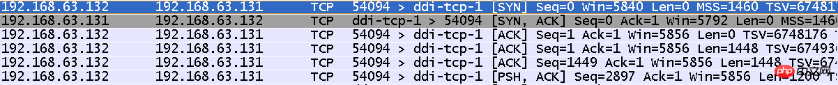 前三次是三次握手的过程,后面三次是传送数据的过程,由于数据大小是4096个字节,所以用了三次进行传递(1448 + 1448 + 1200)。细心的人会问为什么每次传送的最大数据大小不是1460个字节呢?因为这里的TCP携带可选项,TCP头长度 = 20 + 12(可选选项大小) = 32字节。 这样能传输的最大数据为:1500 - 20 - 32 = 1448个字节。