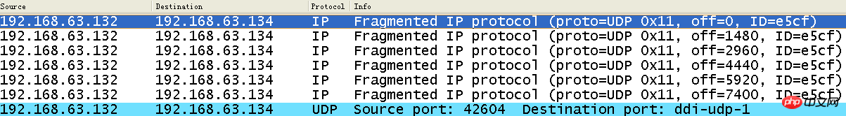 例如:应用层一次性向传输层提交4096个字节数据,这个时候通过wirshark抓包效果如下: