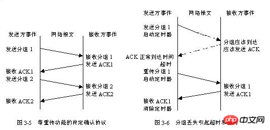 TCP采用一种名为“带重传功能的肯定确认(positive acknowledge with retransmission)”的技术作为提供可靠数据传输服务的基础。这项技术要求接收方收到数据之后向源站回送确认信息ACK。发送方对发出的每个分组都保存一份记录,在发送下一个分组之前等待确认信息。发送方还在送出分组的同时启动一个定时器,并在定时器的定时期满而确认信息还没有到达的情况下,重发刚才发出的分组。图3-5表示带重传功能的肯定确认协议传输数据的情况,图3-6表示分组丢失引起超时和重传。为了避免由于网络延迟引起迟到的确认和重复的确认,协议规定在确认信息中稍带一个分组的序号,使接收方能正确将分组与确认关联起来。