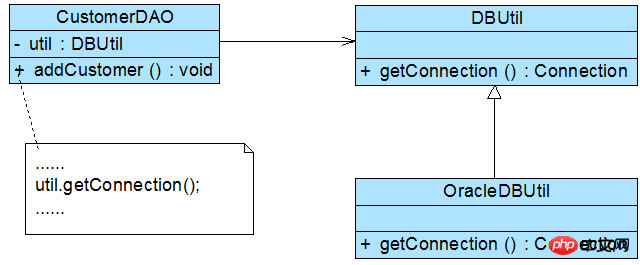 随着客户数量的增加,系统决定升级为Oracle数据库,因此需要增加一个新的OracleDBUtil类来连接Oracle数据库,由于在初始设计方案中CustomerDAO和DBUtil之间是继承关系,因此在更换数据库连接方式时需要修改CustomerDAO类的源代码,将CustomerDAO作为OracleDBUtil的子类,这将违反开闭原则。【当然也可以修改DBUtil类的源代码,同样会违反开闭原则。】