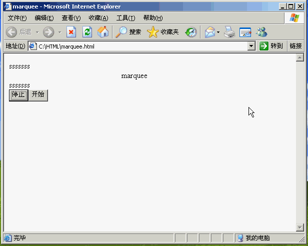 <!DOCTYPE html PUBLIC "-//W3C//DTD XHTML 1.0 Transitional//EN" "http://www.w3.org/TR/xhtml1/DTD/xhtml1-transitional.dtd"> <html xmlns="http://www.w3.org/1999/xhtml"> <head> <meta http-equiv="Content-Type" content="text/html; charset=utf-8" /> <title>marquee</title> </head> <body> <p>sssssss</p> <p id="marquee" style="padding-left:0px;">marquee</p> <p>sssssss</p> <button onclick="return marquee_move_stop()">停止</button> <button onclick="return marquee_move_start()">开始</button> </body> </html>