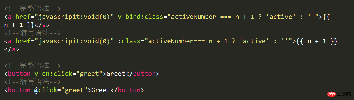 v-bind可以缩写为一个冒号,v-on可以缩写为一个@符号,如下:
