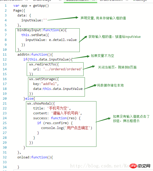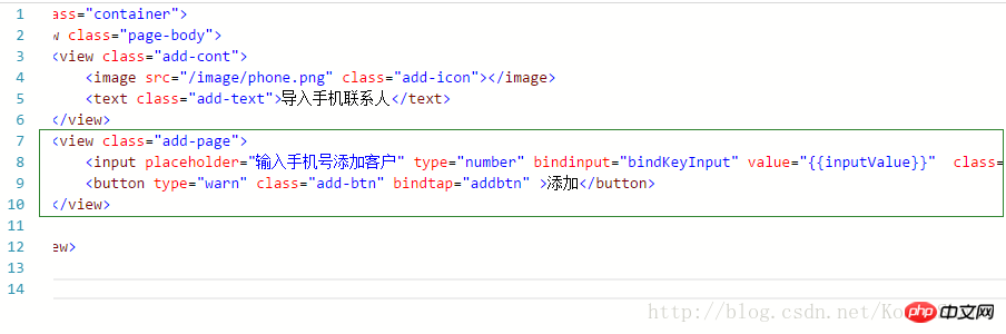 对input输入框,绑定事件bindinput="bindKeyInput" ,设置value="{{inputValue}}" ,因为电话号码为数字,设置type="number" 。对按钮添加点击事件bindtap="addbtn"