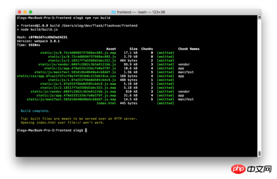 所以/dist文件夹的HTML、CSS、JS会在同一级目录/frontend 。现在你可以运行 $ npm run build 创建一个包。