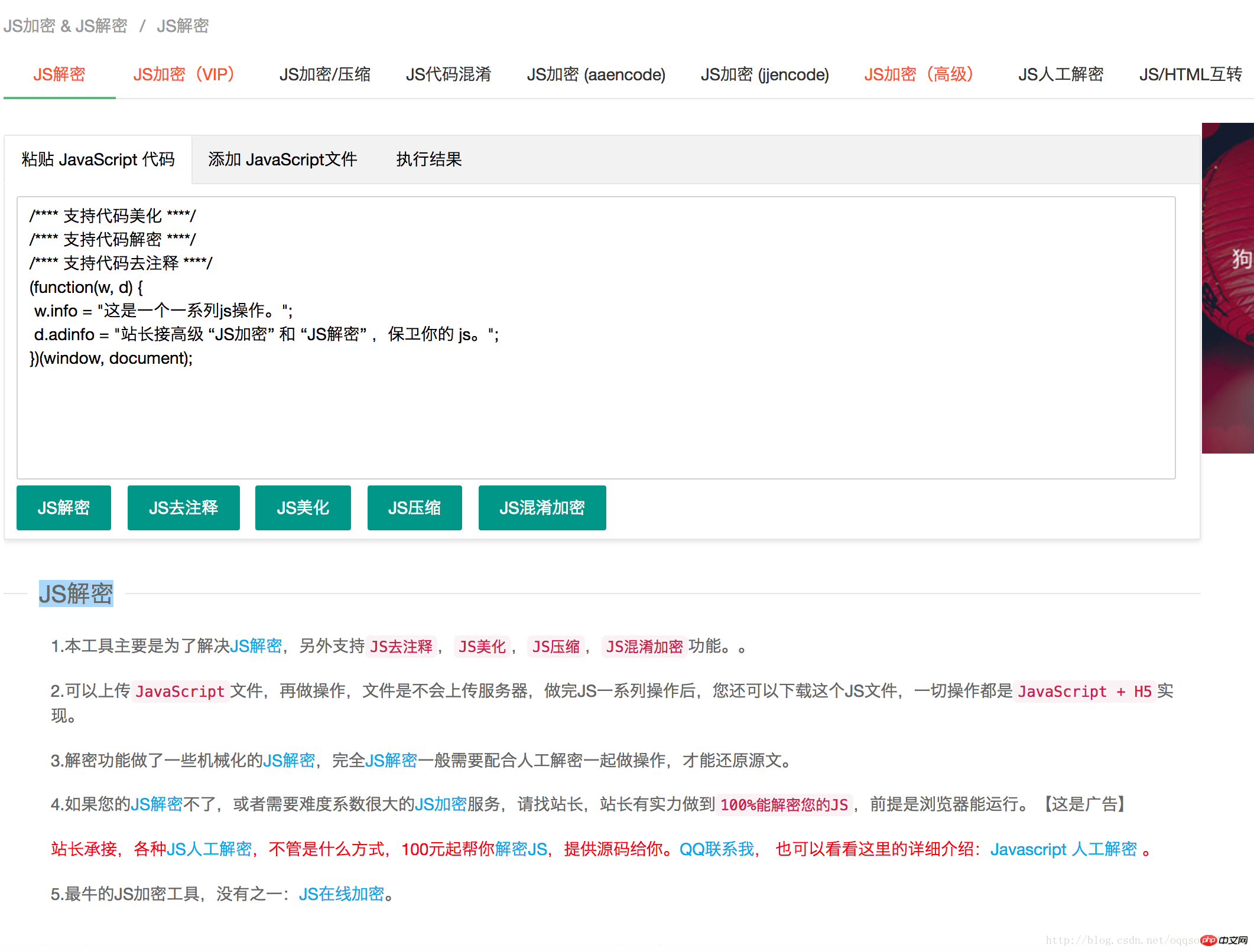 4.如果您的JS解密不了,或者需要难度系数很大的JS加密服务,请找站长,站长有实力做到100%能解密您的JS,前提是浏览器能运行。【这是广告】