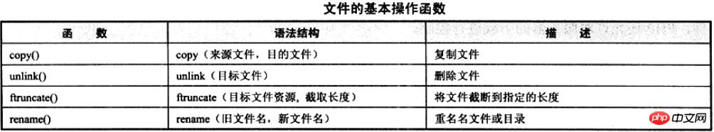 在对文件进行操作时,不仅可以对文件中的数据进行操作,还可以对文件本身进行操作。例如复制文件、删除文件、截取文件及为文件重命名等操作。在PHP中已经提供了这些文件处理方式的标准函数,使用也非常容易,如下表所示: