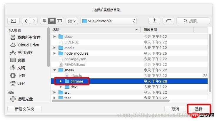 游览器输入地址“chrome://extensions/”进入扩展程序页面,点击“加载已解压的扩展程序…”按钮,选择vue-devtools>shells下的chrome文件夹。
