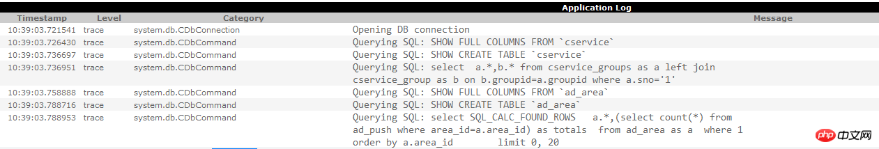 CWebLogRoute表示直接把类型为trace的日志输出在网页下方,system.db.*表示仅记录db的操作,其它的忽略,如下图: