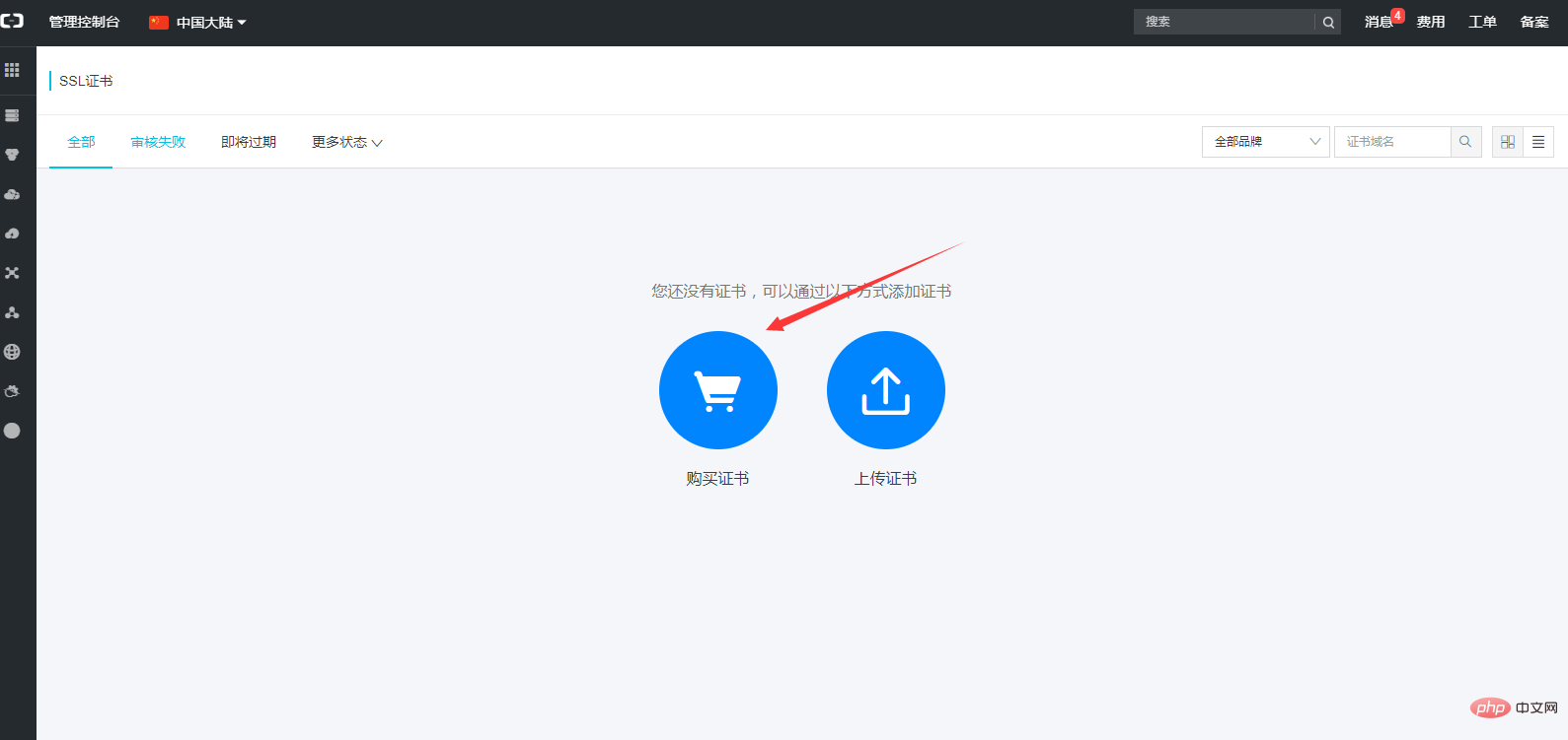 首先登陆阿里云,搜索ssl证书进入ssl证书控制台。点击购买