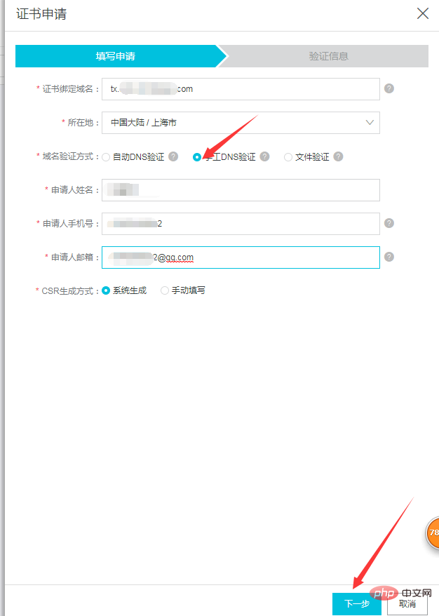 点击下一步,然后需要手动验证即去你的域名所在管理处添加一条解析记录用来验证,验证通过后即可删除。记录值如下: