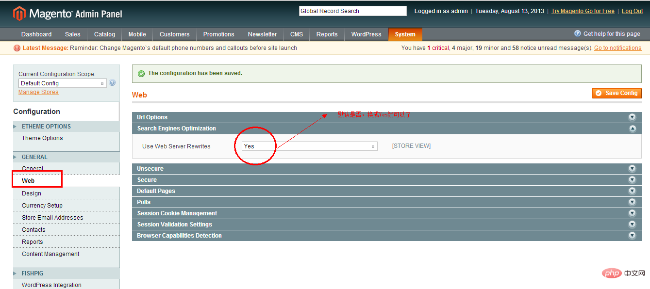 magento去掉“index.php”的方法:首先依次打开“系统-设置-网站-搜索引擎优化”;然后勾选“是”;最后用域名打开即可去掉“index.php”。