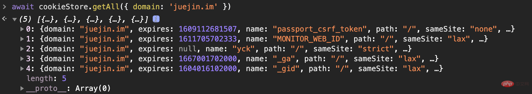 当然除了获取单个 cookie 之外,新的 API 还提供了获取多个 cookie 的方式。比如说现在我想获取所有属于某个 domain 的 cookies,就可以使用如下方式: