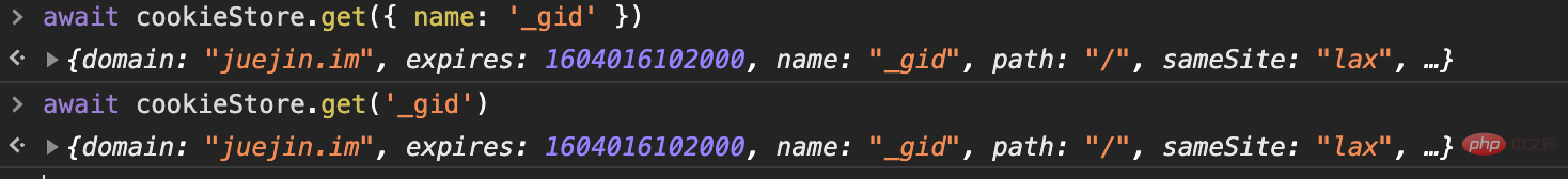 cookieStore.get 有两种函数签名,前者我们可以通过传入 cookie 的属性去匹配想要的内容,后者则是直接传入 name 获取。API 很符合直觉,比之前的方式不知道好到哪里去了。