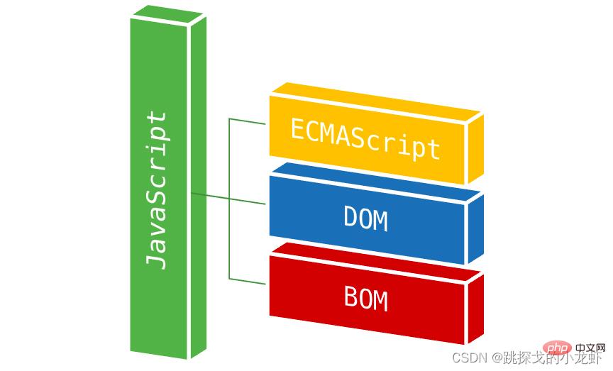 上面这张图,我们可以看到有四个元素:JavaScript,ECMAScript,DOM和BOM,那么它们四个之间有什么联系呢?用一个式子总结它们之间的关系: