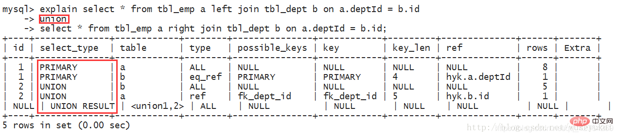 5(id = NULL)、【 … union … 】:代表从union的临时表中读取行的阶段,table列的 “union 1, 4”表示用id=1 和 id=4 的select结果进行union操作。