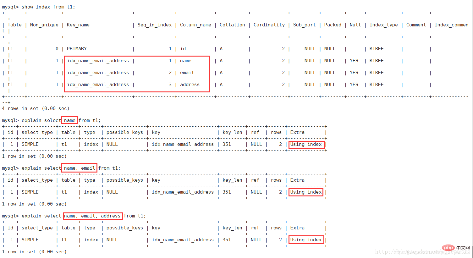 由于索引是先按email排序、再按address排序,所以查询时如果直接按address排序,索引就不能满足要求了,mysql内部必须再实现一次“文件排序”