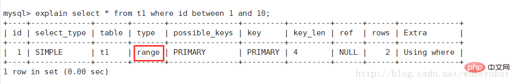 5、range:只检索给定范围的行,使用一个索引来选择行。key列显示使用了那个索引。一般就是在where语句中出现了bettween、<、>、in等的查询。这种索引列上的范围扫描比全索引扫描要好。只需要开始于某个点,结束于另一个点,不用扫描全部索引