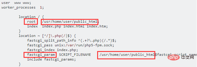 注:这里说明一点,每个版本的nginx配置文件多少有些不一样,但是大体上是相同的,root指的就是默认访问的路径,fastcgi_aram指的就是PHP要解析的路径,这两个路径需要一致才可以访问。