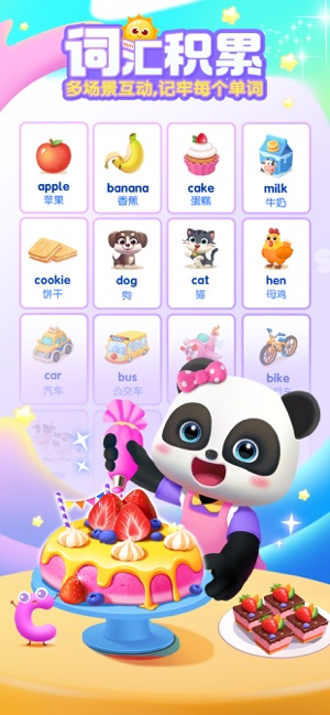 • 多感官英语启蒙:英文单词启蒙模块通过“认说练测”调动儿童多感官参与英文单词互动,高效识记。